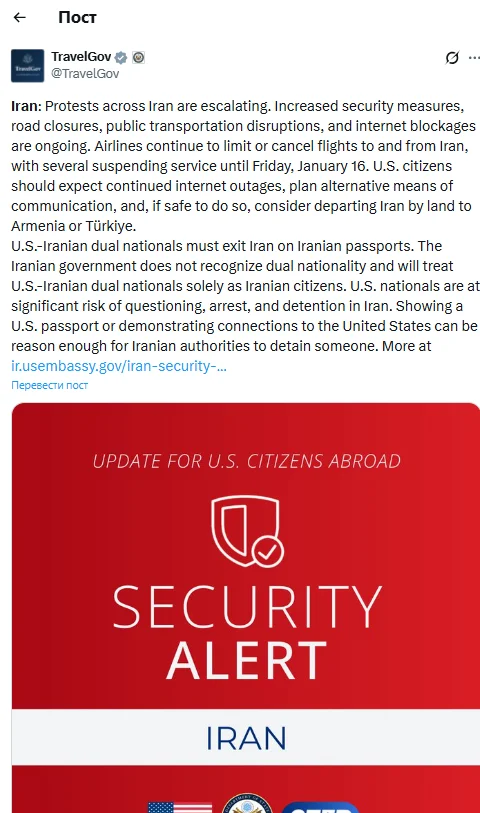 Ավիաընկերությունները շարունակում են սահմանափակել կամ չեղարկել դեպի Իրան և Իրանից չվերթները, որոնցից մի քանիսը կասեցրել են ծառայությունները մինչև ուրբաթ՝ հունվարի 16-ը։ ԱՄՆ քաղաքացիները պետք է պատրաստ լինեն համացանցի շարունակական խափանումներին, ծրագրեն հաղորդակցության այլընտրանքային միջոցներ և, եթե անվտանգ է, դիտարկեն Իրանից հեռանալու հնարավորությունը ցամաքային ճանապարհով՝ Հայաստանի կամ Թուրքիայի տարածքով։