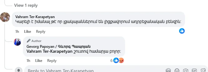 Պապոյանի գրառման մեկնաբանություններում քաղաքացին հարցրել է՝ «Կարելի է իմանալ, թե որ լցակայաններում են լիցքավորում ադրբեջանական բենզին», ինչին, ի պատասխան, նախարարը գրել է․ «Շուտով համարյա բոլոր»։