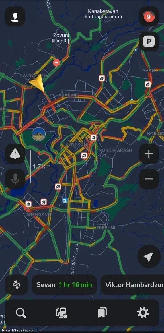 Երևանի մի շարք փողոցներում, տեղական ժամանակով, ժամը 9:00-ի դրությամբ, 9 բալանոց (երթևեկության արագությունը՝ մինչև 3 կմ/ժամ) խցանումներ են՝ ըստ Yandex Navigator-ի։