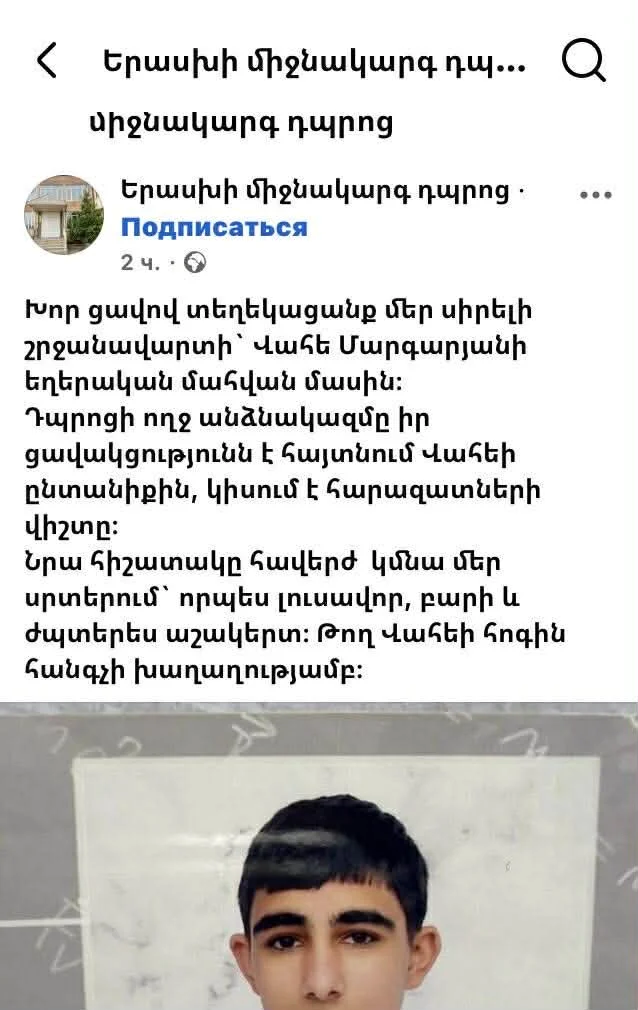 Դպրոցի ողջ անձնակազմը իր ցավակցությունն է հայտնում Վահեի ընտանիքին, կիսում է հարազատների վիշտը։