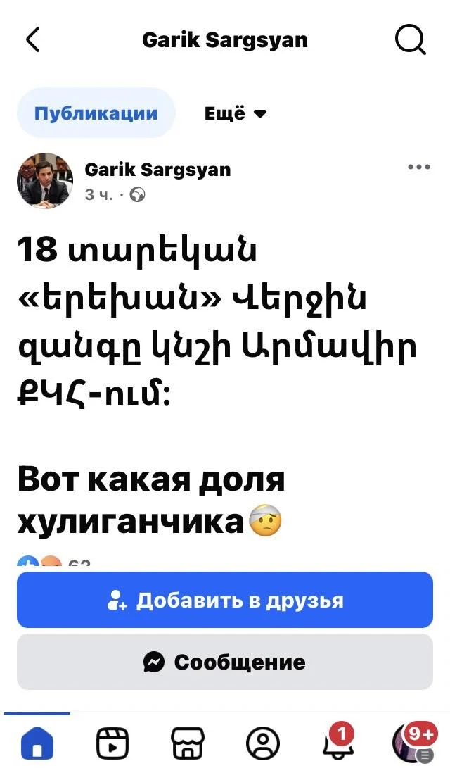 Вот какая доля хулиганчика»,- գրել է Վեդիի համայնքապետ Գարիկ Սարգսյանը՝ նկատի ունենալով 18-ամյա Դավիթ Մինասյանին, ով այսօր դատարանի որոշմամբ կալանավորվել է 2 ամսով, տեղափոխվել «Արմավիր» ՔԿՀ։