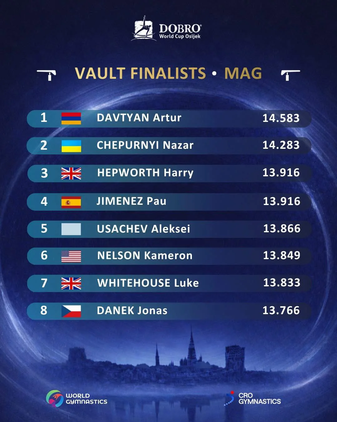 Խորվաթիայի Օսիյեկ քաղաքում ընթացող մարմնամարզության աշխարհի գավաթում Արթուր Դավթյանը հենացատկում գերազանց արդյունք է գրանցել: