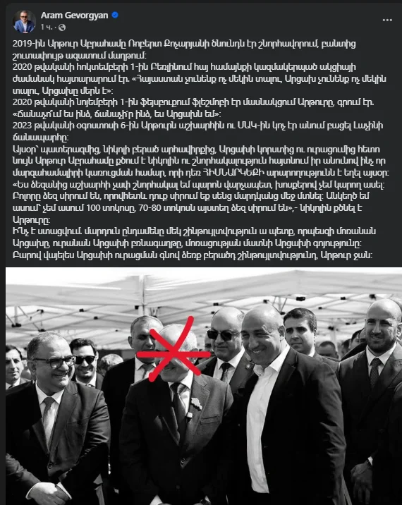 Բարով վայելես Արցախի ուրացման գնով ձեռք բերածդ շինթույլտվությունդ, Արթուր ջան»,- գրել է նա։