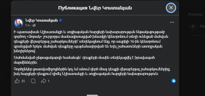 «Գործընկեր լրատվամիջոցներին կոչ եմ անում զերծ մնալ դեպքի վերաբերյալ շահարկումներից, իսկ հարցերի դեպքում դիմել Աշխատանքի և սոցիալական հարցերի նախարարություն»,- ասված է գրառման մեջ: