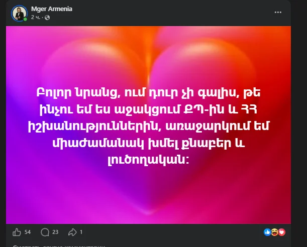 Վերջինս ֆեյսբուքյում իրեն քննադատողներին ուղղված գրառում է կատարել՝
