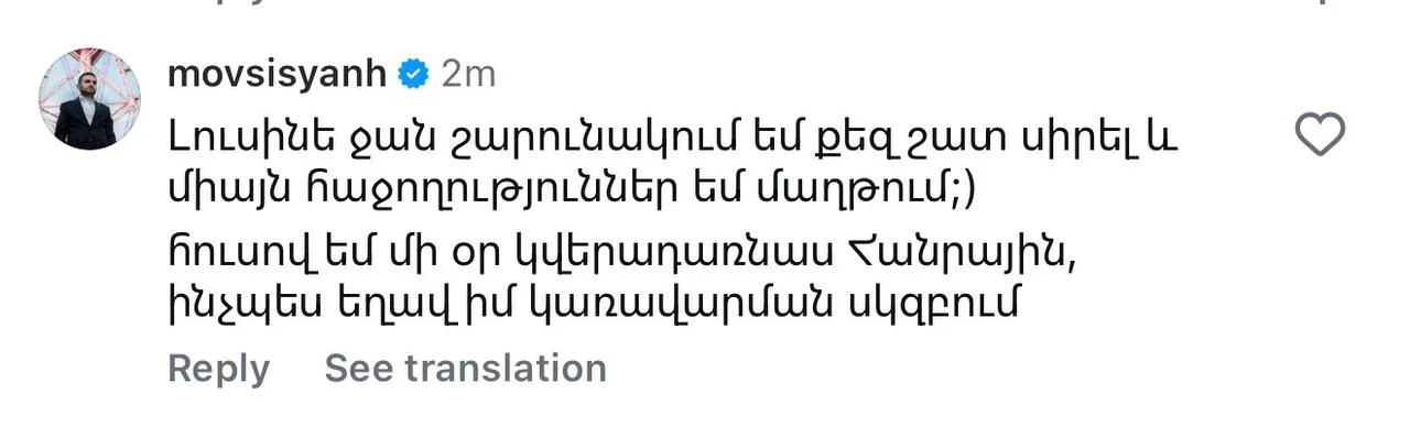 «Լուսինե ջան, շարունակում եմ քեզ շատ սիրել և միայն հաջողություններ եմ մաղթում։ Հուսով եմ՝ մի օր կվերադառնաս Հանրային, ինչպես եղավ իմ կառավարման սկզբում»,- մեկնաբանություներում գրել է նա։