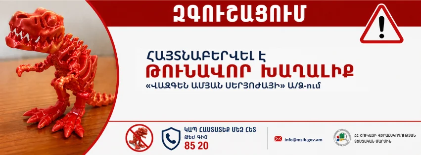 ՀՀ Շուկայի վերահսկողության տեսչական մարմինը վերահսկողական միջոցառումներ է իրականացրել «ՎԱԶԳԵՆ ԱՄՅԱՆ ՍԵՐՅՈԺԱՅԻ» Ա/Ձ-ում։ Տեսչական մարմնից հայտնում են, որ իրականացվել է խաղալիքի նմուշառում, որի արդյունքում պարզվել է, որ «Դինոզավր» անվանմամբ վաճառվող խաղալիքի բաղադրության մեջ առկա են երեխաների առողջության համար վտանգավոր (թունավոր) նյութեր։